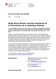 Les membres de la Commission de la statistique fédérale sont nommés par le Conseil fédéral, sur proposition du Département fédéral de l'intérieur, pour une période de quatre ans, laquelle correspond à la législature fédérale. Ses membres peuvent se représenter pour une nouvelle période. La commission compte au plus 25 représentants des cantons et des communes, de la science, de l'économie, des partenaires sociaux, de l'administration fédérale et de la Banque nationale suisse. Elle est présidée par un représentant des milieux scientifiques.