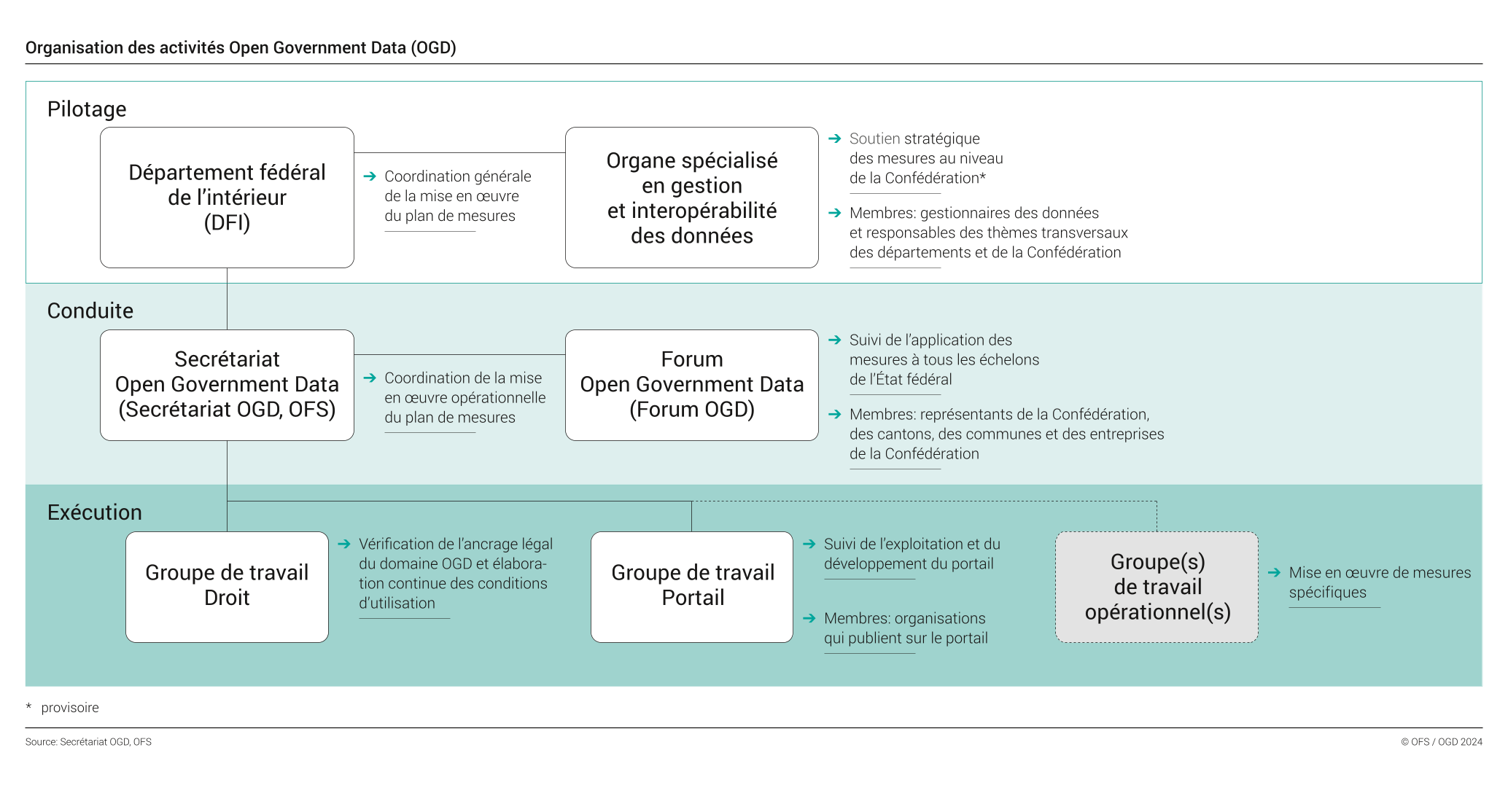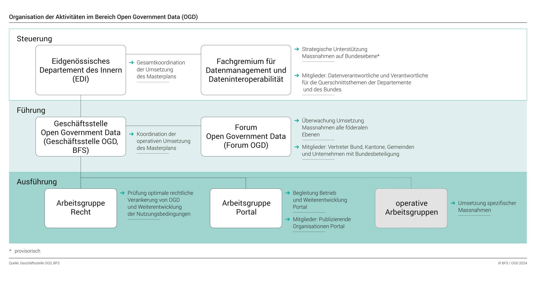 Die Aktivitäten und Dienstleistungen der Geschäftsstelle OGD sind im OGD-Masterplan 2024-2027 aufgeführt und gemäss folgendem Schema organisiert: